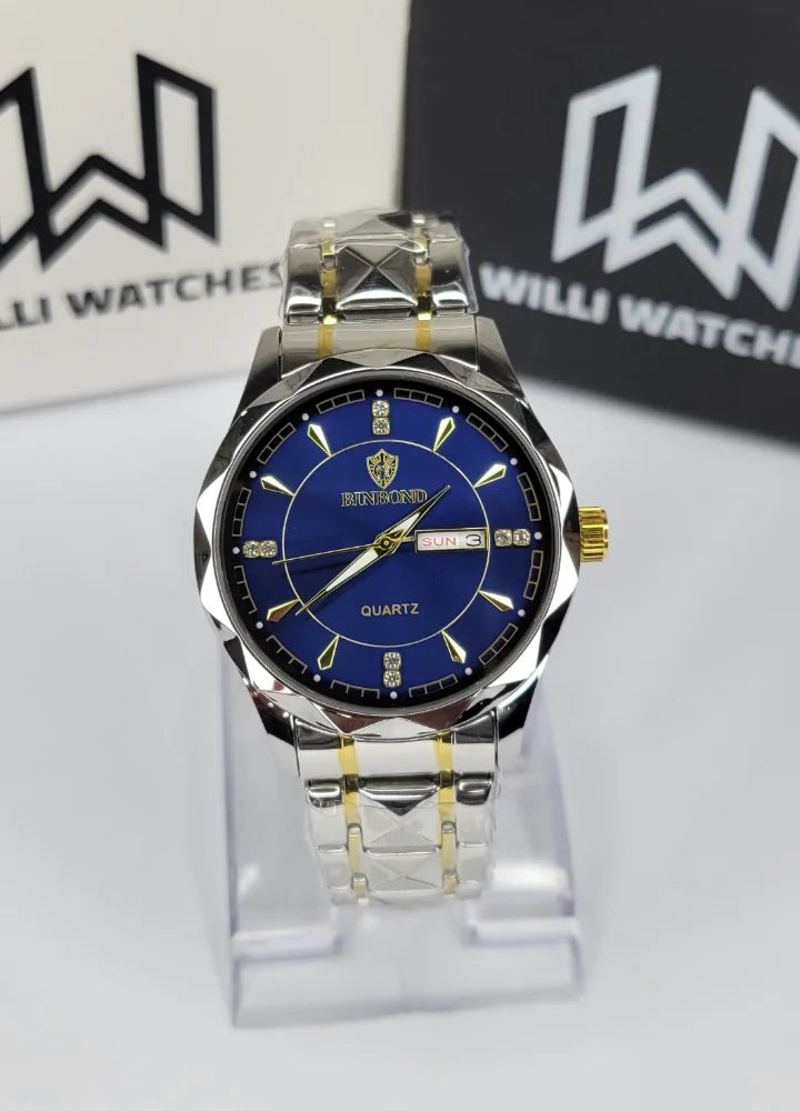The BN-001 from Binbond delivers the perfect blend of luxury and practicality. Featuring a striking two-tone finish and a captivating deep blue dial, this watch offers a stylish look enhanced by day, date, and night indicators — ideal for those who value both beauty and performance.