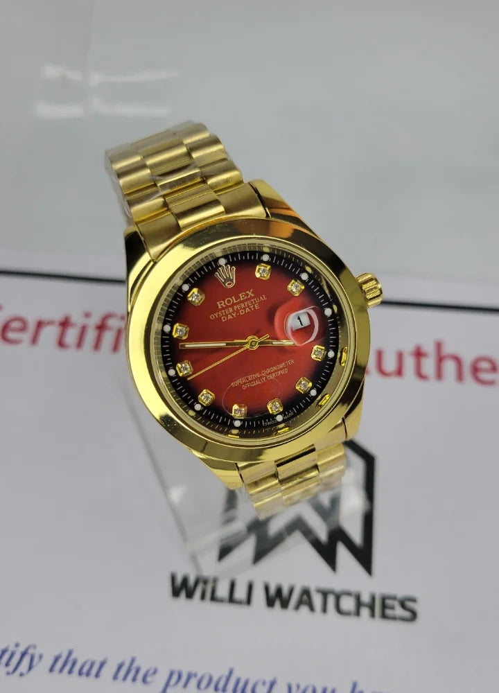 • Elevate your style with the RLX Gold Red Dial Watch R-009 — a luxury men’s timepiece that fuses bold color with elegance. This stainless steel red dial watch boasts a radiant red face, gold band, and precise quartz movement. Perfect for those who want a statement piece among men’s affordable luxury watches without sacrificing durability or style.