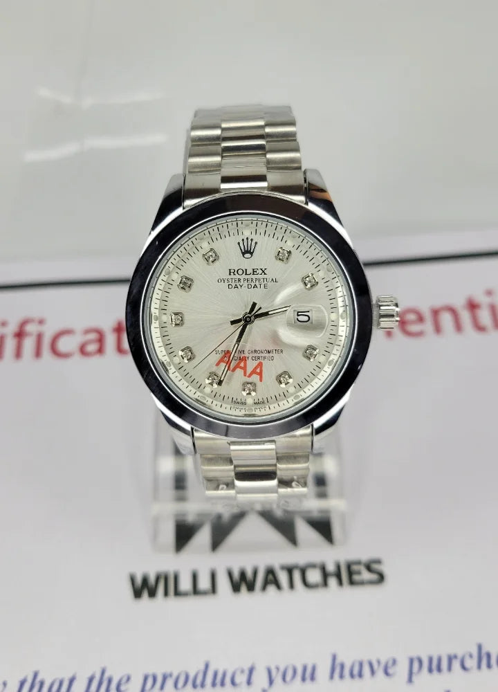 • White Dial with Date Display – clean white face with date for punctual elegance.